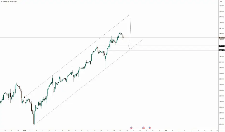 - Après un sommet local, le prix consolide sous la borne haute ; zone de polarité marquée à 24 388 puis 24 311 (ex-résistance → support).