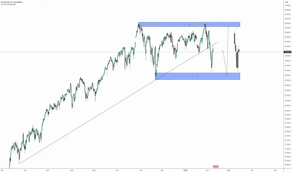 Le NASDAQ entame cette semaine dans une zone de "neutralité nerveuse". Après avoir testé les 25,000 sans succès à plusieurs reprises ces derniers jours, l'indice semble s'essouffler. La structure actuelle favorise une baisse corrective. Le marché digère les craintes liées à une "bulle de productivité" alors que les géants du logiciel subissent la concurrence des nouveaux outils d'automatisation d'Anthropic.