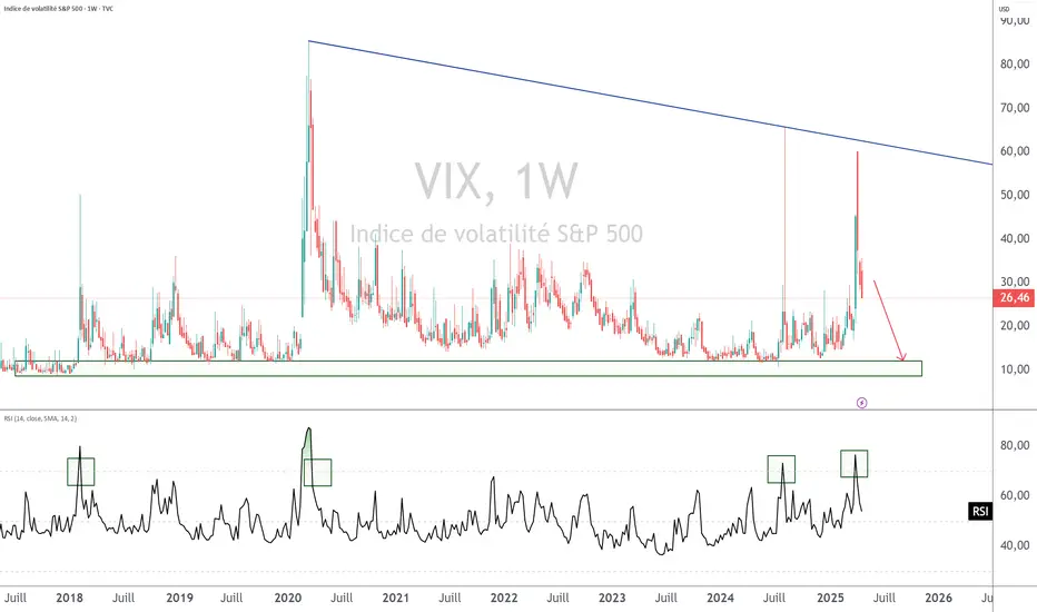 1) Tout d’abord, le graphique de la volatilité implicite des actions qui composent l’indice S&P 500, le VIX. Le surnom de cet indice est « l’indice de la peur ». Son calcul est basé sur le prix des options call et put des actions qui composent l’indice S&P500. Rappelons que le S&P 500 est considéré comme l’indice de référence de la finance occidentale