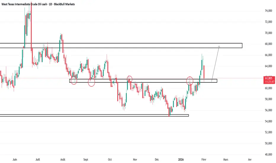 Sur le graphique journalier du pétrole WTI, le marché montre une phase de reprise après une longue période de consolidation baissière. Les prix ont récemment rebondi depuis une zone de support majeure située autour de 55–56 $, niveau déjà défendu à plusieurs reprises par le passé, ce qui confirme la présence d’acheteurs structurels sur cette zone.