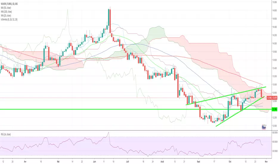 L'argent a connu une période faste ces dernières semaines en passant de 12 à 12.80. L'échec sur le haut du nuage ichimoku daily empêche l'argent d'aller plus haut pour le moment. la configuration en biseau ascendant laisse envisager d'une correction à court terme sur l'horizon de temps daily. J'attends une consolidation sur 12.4 avant de refaire le plein . les indicateurs sont sur achetés (sto, rsi) . le franchissement haussier de la zone 12.80-13 sera un signal haussier très important. 2 stratégies: vous payez le bas du nuage sur 12.40 ou vous attendez une franche accélération au dessus du niveau cité pour vous positionner à l'achat une fois le signal donné. Bons trades!