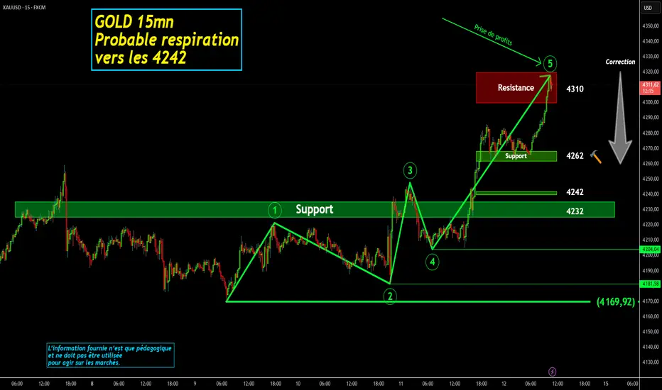 🥇 GOLD 15MIN : ATTENTE PULLBACK STRATÉGIQUE - ZONE D'ACHAT 4262 / 4242