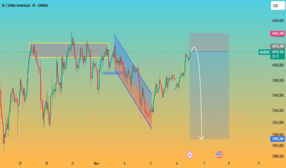 Le graphique montre que XAUUSD atteint une forte zone de résistance horizontale autour de 4015–4020, un niveau où le prix a déjà été rejeté plusieurs fois (zone jaune). Même si l’or est récemment sorti d’un canal baissier, indiquant un élan haussier à court terme, le prix commence de nouveau à montrer des signes de faiblesse sur cette résistance clé.