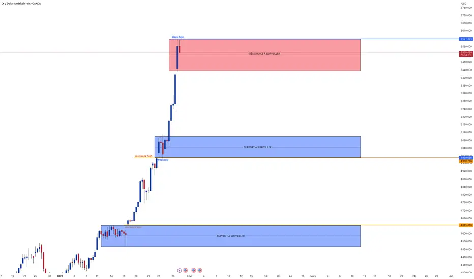 Analyse technique : L'Or (XAU/USD) a officiellement basculé dans une phase de volatilité extrême, atteignant un nouveau sommet historique (ATH) à 5611.00 avant de se stabiliser ce matin sous la barre des 5600. La structure est parabolique, propulsée par la faiblesse persistante du DXY (96.00) et les tensions géopolitiques majeures qui poussent les investisseurs vers les valeurs refuges sans aucune retenue.