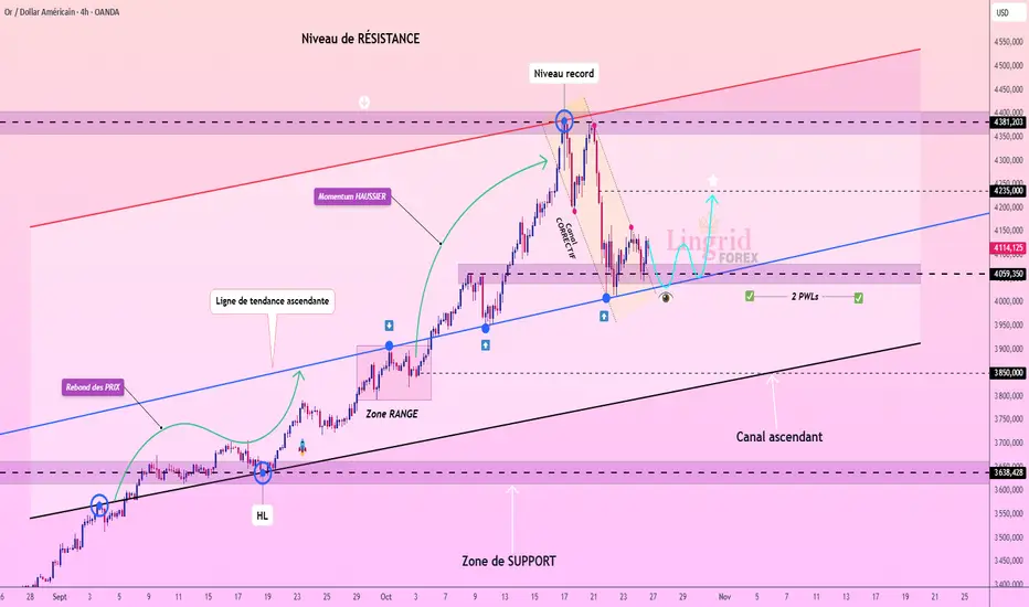 Le graphique 4H montre qu'après une hausse explosive vers le niveau record (ATH) proche de 4 380 dollars, le prix a rencontré une forte résistance. La baisse qui a suivi a formé un canal correctif classique, confirmant la nécessité pour le marché de digérer ses gains. La conclusion principale ? La ligne de tendance haussière reste intacte, agissant comme un niveau de soutien dynamique. Tant que le prix se maintient au-dessus de cette ligne de tendance haussière et du canal haussier plus large, la tendance haussière principale reste intacte. Une cassure en dessous de 3 900 $ serait un signal d'alerte ; un rebond à partir de ce niveau pourrait déclencher un puissant nouveau test de la zone ATH.