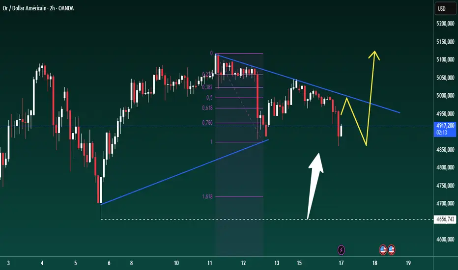 L'or sur H2 se négocie à l'intérieur d'une structure en contraction, avec une résistance descendante qui exerce une pression tandis que des plus bas plus élevés sont toujours défendus. Le prix tourne actuellement autour de la zone de retracement de Fibonacci 0.5–0.618 après avoir rejeté le récent plus haut swing.