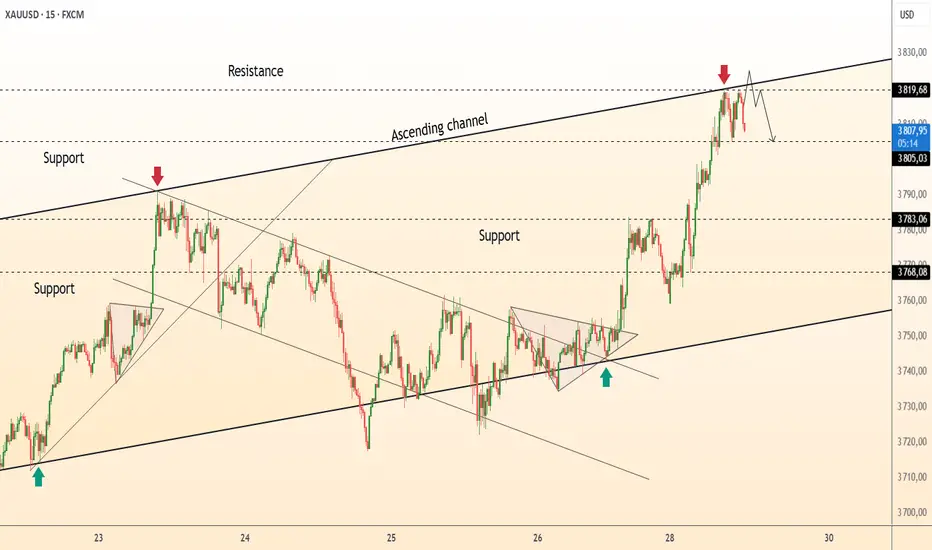 ● Le XAU/USD a atteint une résistance à 3819 dans le canal ascendant, montrant des signes de rejet et formant un possible modèle de retournement.