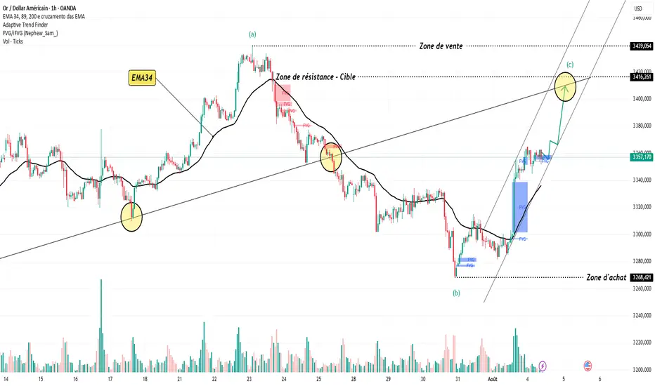 Bonjour les traders. Le prix de l’or montre une reprise nette après un rebond fort depuis la zone des 3.268, combiné avec un FVG non comblé à proximité. Actuellement, l’or forme une structure en vague (c) haussière à l’intérieur d’un canal ascendant. L’EMA34 est orientée à la hausse et le volume soutient également ce mouvement. Les objectifs immédiats se situent à 3.416, voire 3.439 en extension.