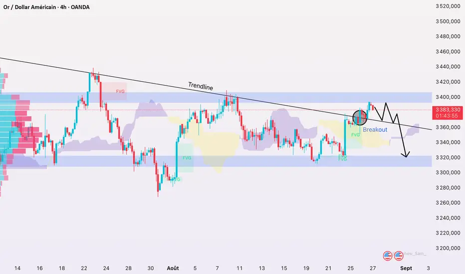 En observant le graphique de l’or (XAU/USD), on constate que le métal précieux bute sur une zone de résistance importante autour de 3.380–3.385 $, où se croisent un FVG d’offre et la limite supérieure du nuage Ichimoku. Les bougies récentes révèlent une pression vendeuse notable : petites tailles de corps, mèches allongées et volumes peu dynamiques. Ce comportement illustre un essoufflement de la demande et ouvre la voie à une correction vers 3.355 $, voire 3.345 $ si le mouvement s’amplifie. Toutefois, une cassure nette au-dessus de ce seuil, validée par le volume, relancerait la dynamique haussière vers 3.400–3.425 $.