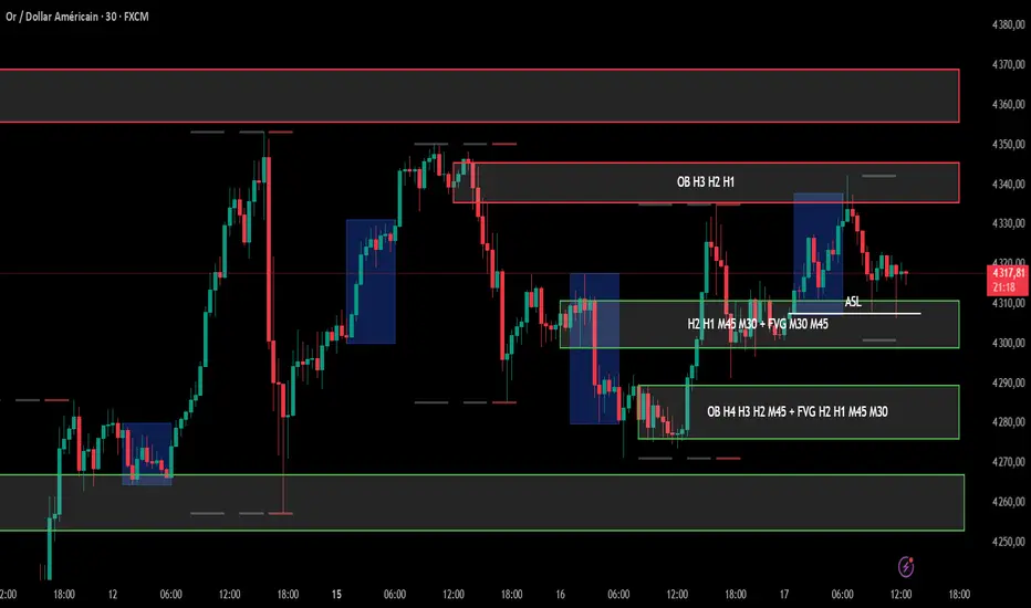 1. Ma première zone d’achat est 4310 - 4299, on y voit un un OB en h2, h1, m45 et m30 + de la FVG en m45 et m30. Le GOLD a rejondi 1 fois dessus.