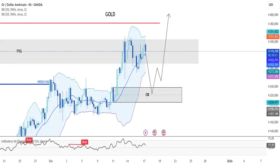 Pour l’instant, le GOLD évolue dans un range bien identifié, directement sur la FVG H4 bearish située autour des 4300.