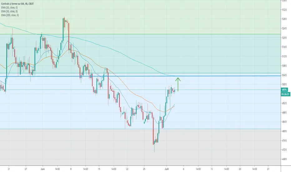 Croisement des moyennes mobiles 20 et 50 sur le blé, opportunité d'achat avec objectif à 502 cents.
