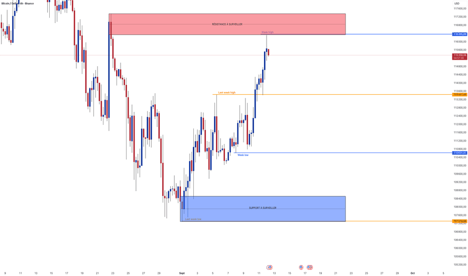 BTC | L’ANALYSE DU JOURAnalyse technique : tant qu’on reste sous le week high 114 358$, un rejet peut ramener le prix vers le last week low 111 686$ puis la zone de support et week low 108 800–109 000$ ; à l’inverse, une reprise au-dessus de 114 358$ ouvrirait la voie vers 118 362$ (last week high) puis la grande zone d’offre 121–124 k$.