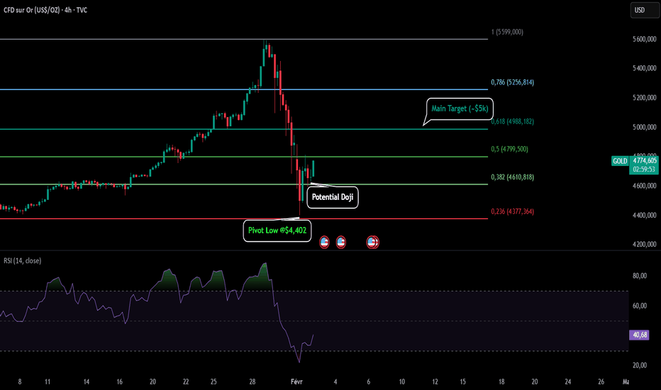 OR (XAUUSD) | L’ANALYSE DU JOURAnalyse technique : L'Or (XAU/USD) tente de panser ses plaies ce mardi après le séisme qui l'a propulsé de 5600 à 4500 en un temps record. Le prix évolue actuellement sous les 4900, cherchant à stabiliser son rebond. Cette zone des 4900 - 4950 est critique : elle représente le premier retracement sérieux (38.2% de Fibonacci) de la chute vertigineuse subie la semaine dernière. Le sentiment reste fragile, les investisseurs hésitant entre le rachat à bon compte et la crainte d'une nouvelle jambe de baisse alimentée par le "Warsh Effect" à la Fed.