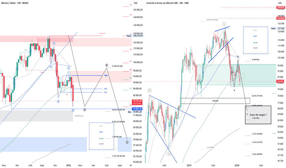 BTC- Weekly - Log - Retour au 100k ou flush 60 K ?BTC index / BTC CME – Weekly (log) – Retour vers 100k : scénario ou simple rebond ?