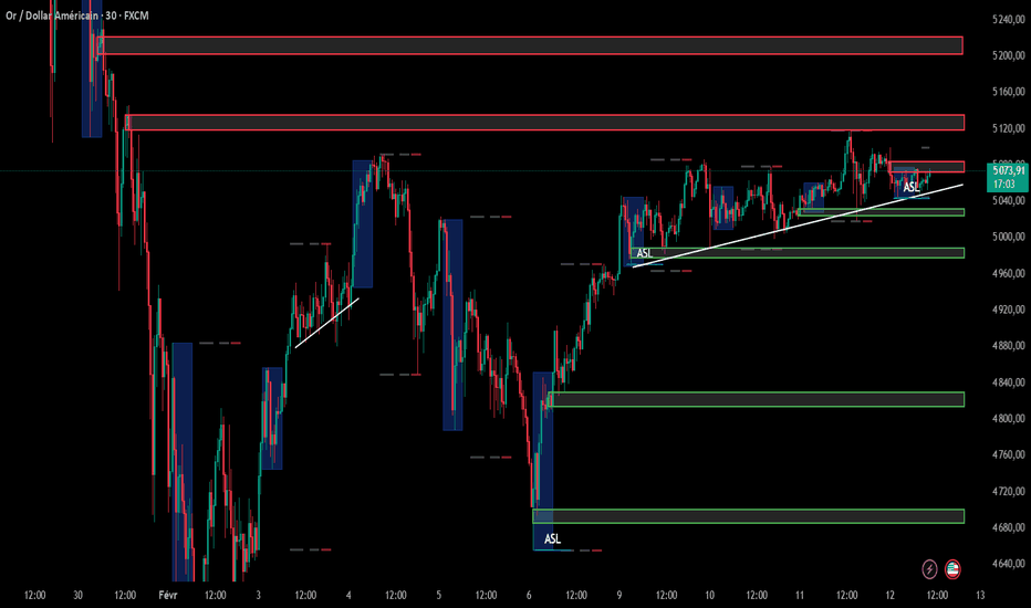 XAUUSD M30 - NE RATEZ PAS CETTE OPPORTUNITÉL'Or reste sous pression vendeuse immédiate tant qu'il évolue sous les 5070. Ce niveau, qui servait de résistance psychologique depuis le début de la semaine, a agi comme une barrière infranchissable face au rebond du Dollar. La structure M30 valide désormais un scénario de baisse corrective profonde visant les 4835. Ce niveau de 4835 correspond à un Order Block non mitigé et à une zone de liquidité externe (Sell-side) majeure. Une fois ce "nettoyage" effectué, le marché aura le carburant nécessaire pour amorcer une véritable reprise de hausse vers les 5200.