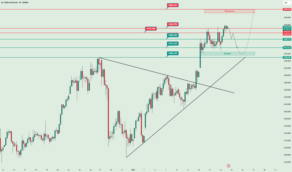 OR (XAUUSD) | L’ANALYSE DU JOURAnalyse technique : L'Or (XAU/USD) montre des signes de rejet sous la résistance des 4630.00, favorisant un repli technique vers le support psychologique majeur des 4600.00. Une cassure confirmée de ce niveau pourrait entraîner le prix vers l'Order Block situé à 4575.00 pour combler les déséquilibres récents. Les acheteurs devront impérativement reprendre les 4635.00 en clôture H8 pour viser de nouveaux sommets vers les 4670.00.