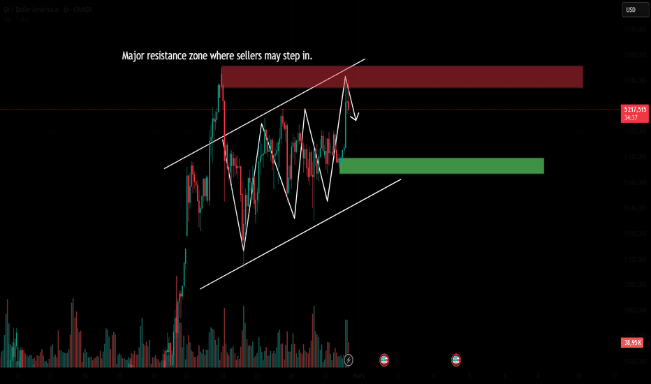 L'or évolue actuellement dans une zone de résistance intraday critique, autour de 5 185 – 5 195, une zone qui a précédemment fait office de zone d'offre. Le cours vient d'effectuer une forte impulsion haussière, soutenue par une augmentation des volumes, ce qui indique une forte pression acheteuse.