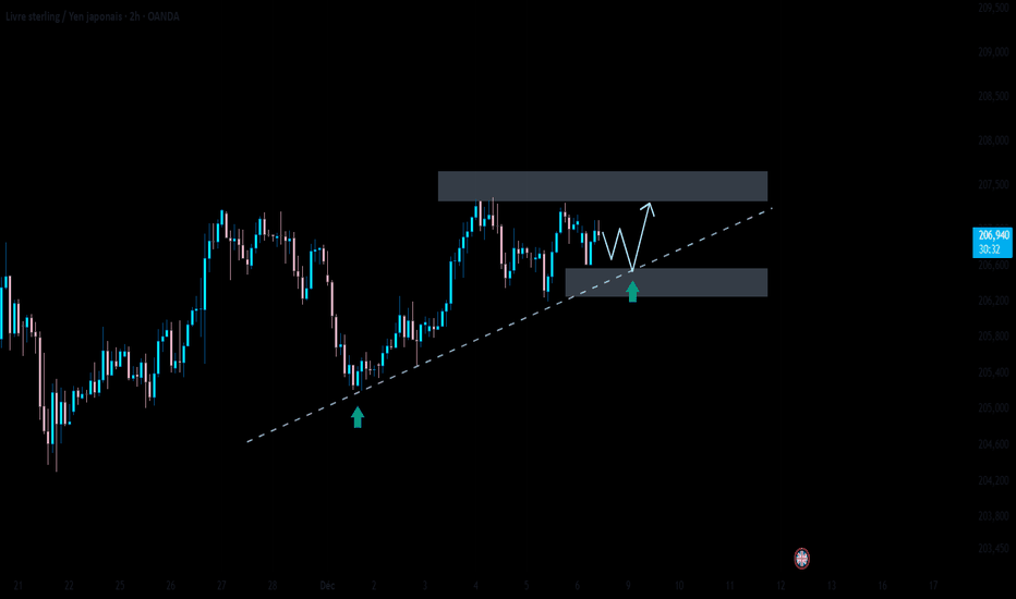 Mon scénario privilégié: laisser le prix “respirer” vers 206,5 et observer la réaction des bougies ; si un signal haussier clair apparaît, on peut envisager un achat dans le sens de la tendance, avec un premier objectif autour de 207,3. Tant que le prix reste au-dessus de la trendline et ne casse pas franchement sous 206,5, je considère toujours le GBPJPY comme une opportunité à l’achat, en profitant des corrections plutôt que d’essayer de vendre à contre-tendance.