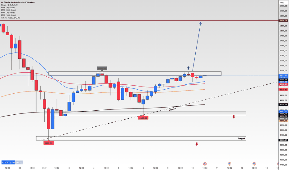 GOLD / OR : Analyse technique pour le 11 février 2026Le prix est actuellement rejeté par la résistance des 5 090 $ et consolide juste en dessous. Dès l’ouverture des marchés ce matin, un gap baissier marqué (-0,82 %) s’est formé sur la première bougie, reflétant une pression vendeuse immédiate.