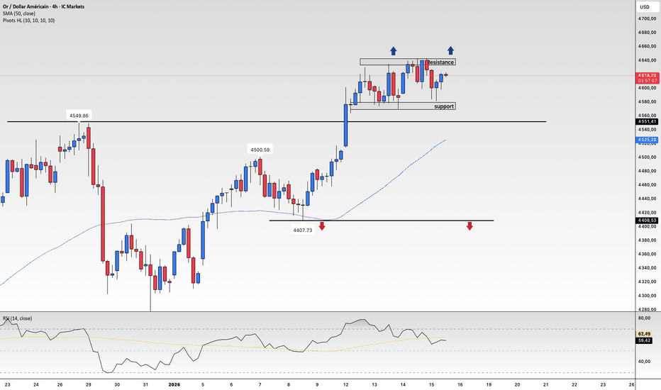 Le prix est enfermé dans un range intraday majeur entre 4650 et 4550, marquant une phase d'accumulation ou de distribution après l'impulsion haussière journalière. Bien que la tendance de fond reste haussière, l'incapacité à franchir le sommet suggère un essoufflement temporaire. Une rupture du support de range est attendue pour déclencher une correction saine vers les paliers de liquidité inférieurs.