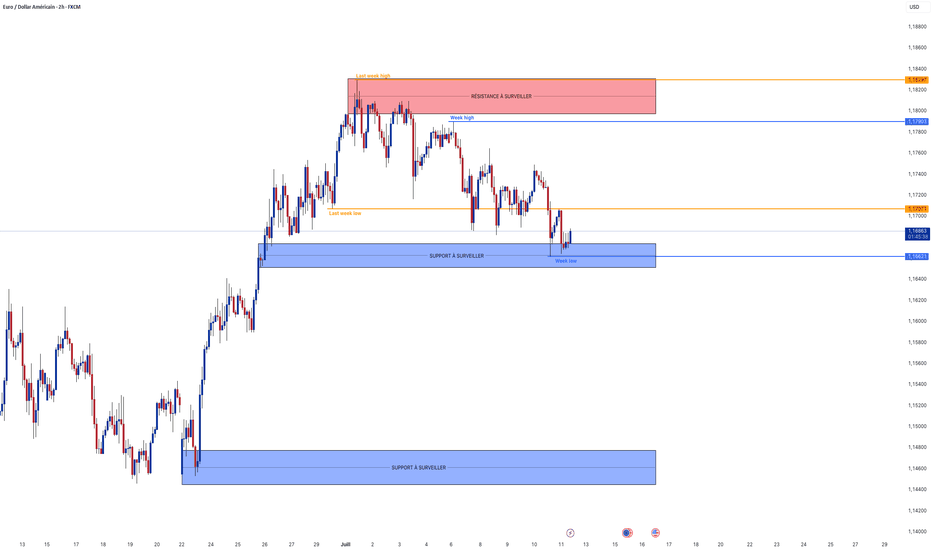 Analyse technique : Ce setup sur l’EURUSD montre une hésitation au cœur d’une zone de compression entre le high et le low hebdomadaire : une cassure haussière au-dessus de 1.16800 pourrait relancer une poussée vers la résistance de 1.17220 voire 1.18000, tandis qu’un rejet et une cassure sous 1.16100 ouvriraient potentiellement la voie vers le support majeur autour de 1.15000.