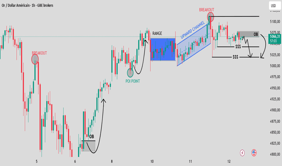 XAUUSD 1H – Échec de la structure haussière et poursuite ?L’or respectait auparavant une structure de marché haussière, en consolidant dans une zone de range avant de s’engager dans un canal haussier. Cette phase traduisait une accumulation saine et une continuité de tendance, soutenue par des sommets et des creux de plus en plus hauts.