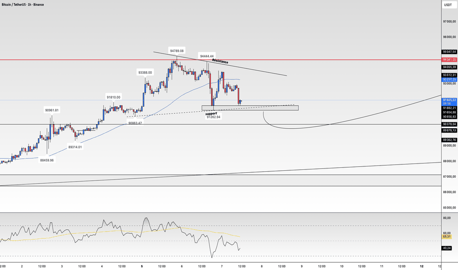 Le retracement actuel se dirige vers la ligne de tendance haussière et le support horizontal → correction saine, pas de retournement 🟦