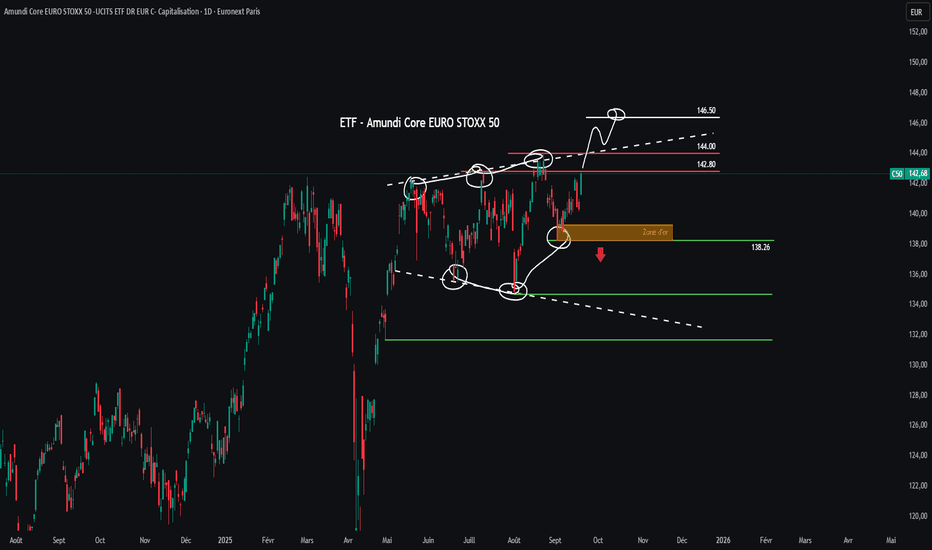 CSPX – Une ETEi en construction ?Observation intéressante sur l’ETF CSPX (iShares Core S&P 500) en unité journalière : le prix semble former une épaule-tête-épaule inversée (ETEi), figure classique de retournement haussier.