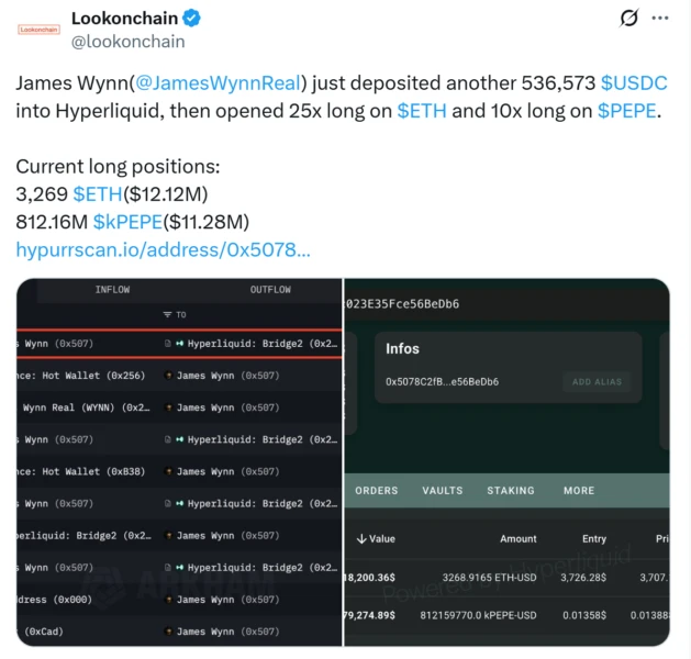 High-leverage trader James Wynn opens 25x long on ETH, 10x on PEPE