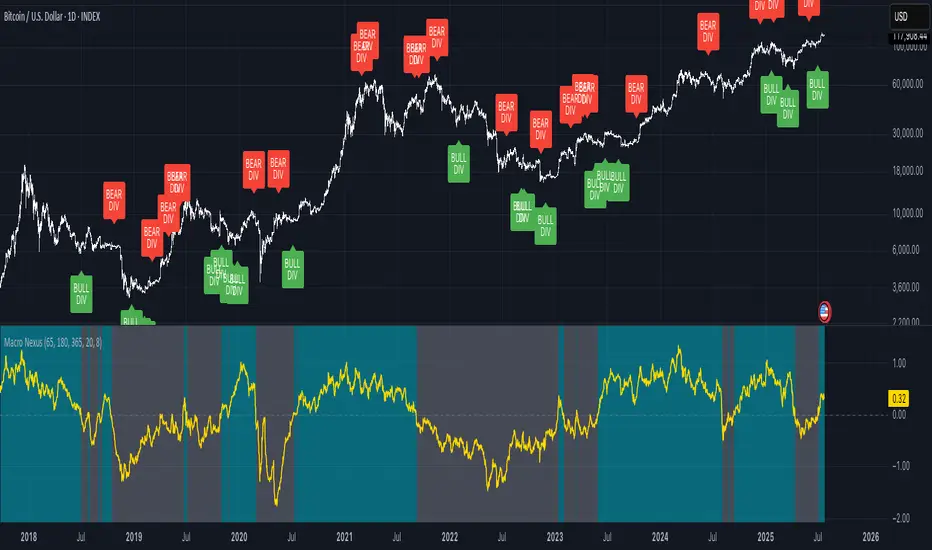Automated Divergence Detection: The MNM automatically identifies and plots powerful bullish and bearish divergences between the macro trend and price, providing clear, early warnings of potential market tops and bottoms.