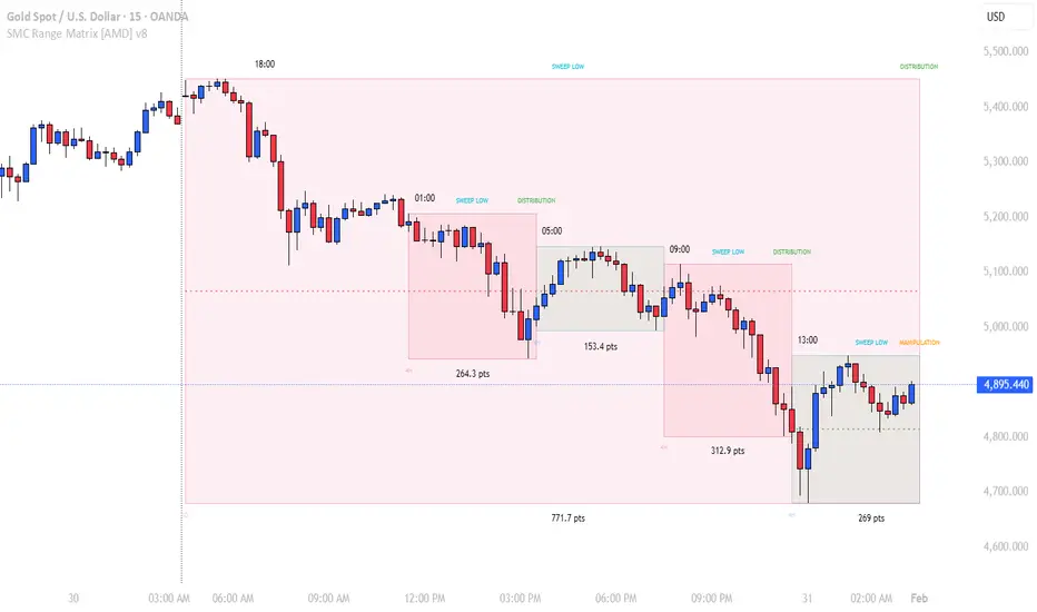 **SMC Range Matrix** is a comprehensive Smart Money Concepts (SMC) indicator designed for ICT/SMC traders. It combines multi-timeframe range analysis with advanced Fair Value Gap detection, Inverted FVG tracking, Volume Imbalance zones, and AMD (Accumulation-Manipulation-Distribution) phase detection — all in one powerful tool.