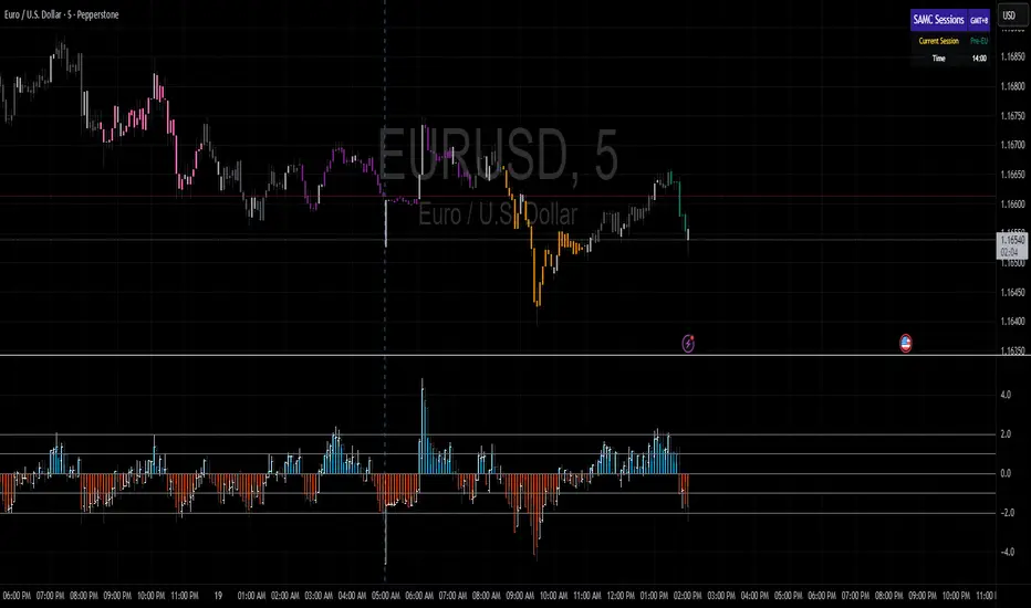 Although the initial idea was developed for stocks and commodities, I've carefully back tested this as an oscillator across FX MAJORS , MINORS and high liquidity stocks for the use case of scalping and Medium term trade ideas.