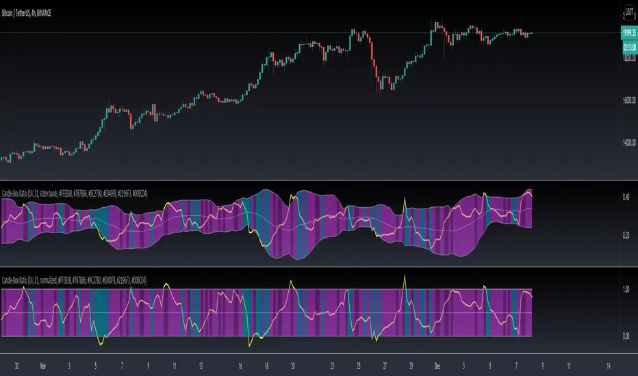 Generally during a squeeze or compression the ratio between the candles and the rectangular area increases, ie the candles occupy a larger portion of the rectangle, and vice versa during a release/expansion. It is inherently low lag due to the lack of any averaging in the calculation since the start of an expansion/breakout will instantly change the dimensions of the encompassing rectangle and the corresponding ratio. A potential downside is that different lengths will produce significantly different results which will require tuning to optimize for specific instruments and timeframes.