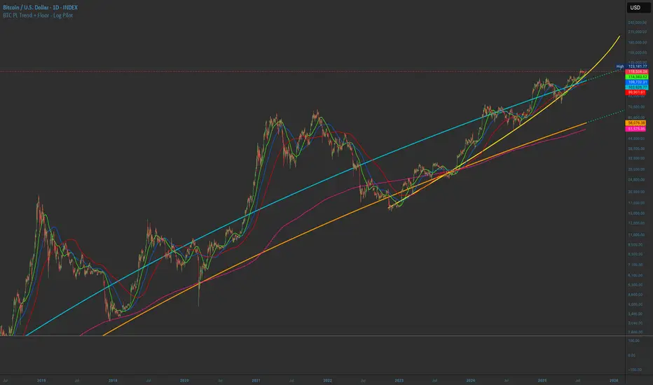Tracks Bitcoin’s long-term arc and structural support through time since Genesis.