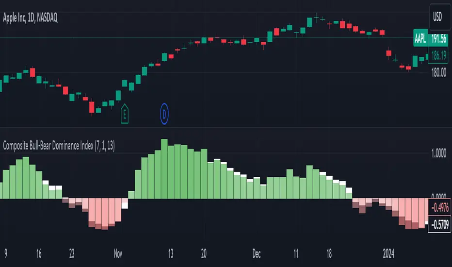 The Composite Bull Bear Dominance Index (CBBDI) is a indicator that combines up down volume analysis with Bull and Bear Power to provide a comprehensive view of market dynamics. It calculates Z-scores for up down volume delta and bull bear power measures, averages them, and then smoothes the result using Weighted Moving Average (WMA) for Bull and Bear Power and Volume Weighted Moving Average (VWMA) for Up and Down Volume Delta. The advantages include responsiveness to short-term trends, noise reduction through weighting, incorporation of volume information, and the ability to identify significant changes in buying and selling pressure. The indicator aims to offer clear signals for traders seeking insights into overall market dominance and indicate if the bulls or the bears have the upper hand.