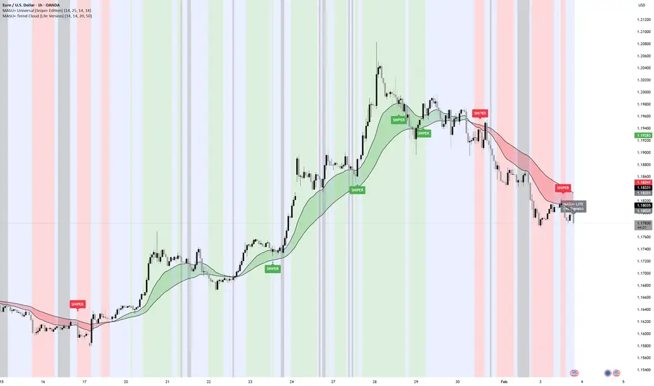 MASU+ Universal is different. It features a built-in Market Regime Engine that automatically detects the state of the market. It disables signals during noise (Choppiness) and only activates "Sniper Mode" when a strong trend is confirmed.