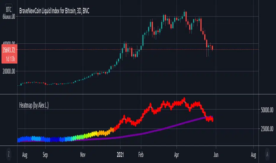 This indicator is a based on "200 Week Moving Average Heatmap" by Plan B. It shows "heatmap" of a security based on % increase of its 200 week (or other) moving average. It can be used for Bitcoin, as well identifying overheated Stocks (like TSLA). Plan B designed this indicator for Bitcoin using MA = 1400 (which is 200 trading days in Crypto), I personally found it useful to indicate overheated Stock Market stocks using MA = 250 (which is ~1 year of net trading days, excluding weekends and holidays).