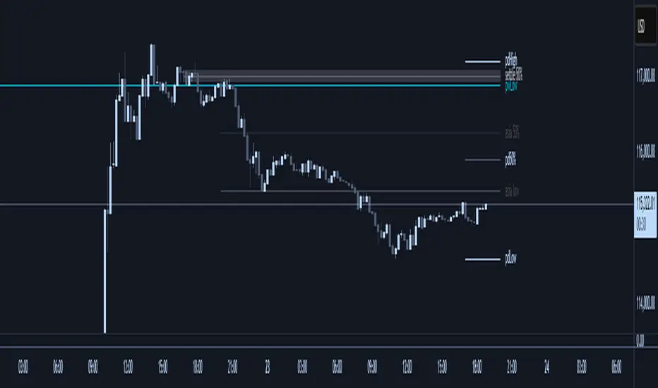 Born from forex institutional timing principles, this tool has been precision-engineered for the relentless pace of Bitcoin and cryptocurrency markets. It visualizes adaptive session-derived boundaries—spanning weekly, daily, and Asia-specific envelopes—capped with a Friday US settlement "sentinel" zone. Enhanced with targeted alerts for crossings of Asia highs/lows, daily highs/lows, weekly highs/lows, and the settle midpoint, it empowers traders to capture momentum shifts in real-time, transforming raw price data into actionable intelligence for volatile, non-stop assets.