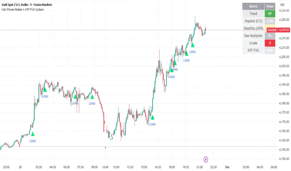 XAU Power Meter + HTF FVG System is an execution-support tool for XAUUSD that combines: