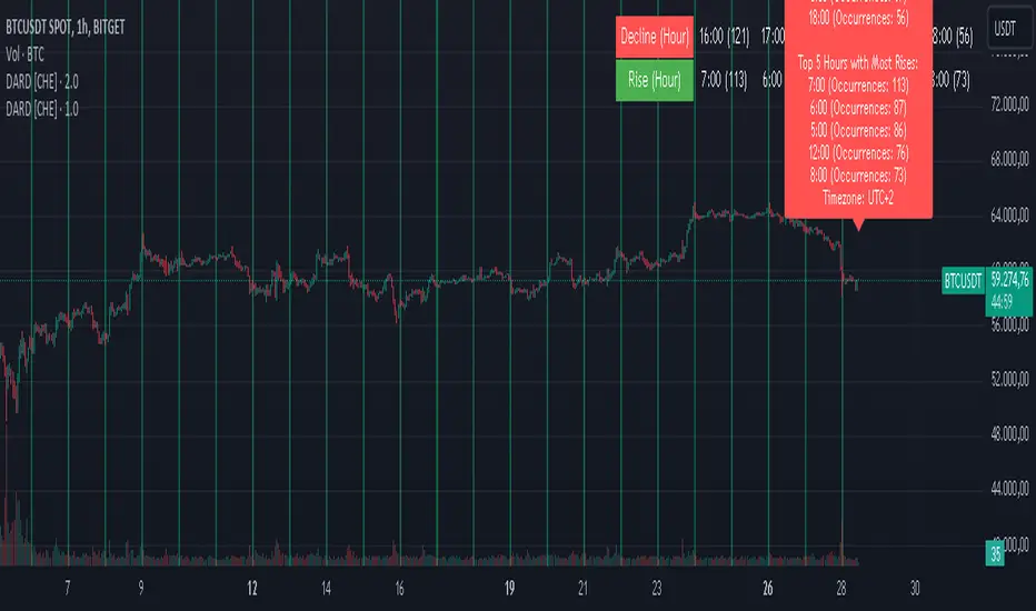 The "Decline and Rise Detective [CHE]" is a TradingView indicator designed to identify the hours within a trading day that experience the largest price declines and rises. This indicator provides a visual representation of this data, offering traders valuable insights into the most frequent hours for significant price movements. It is most effective when used with a timeframe of 1 hour or greater.