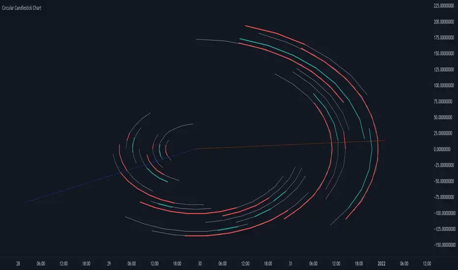 The most recent candles are further away from the circle origin. Note that OHLC values follow a clockwise direction. A higher arc length would indicate candles with a higher body or wick range.