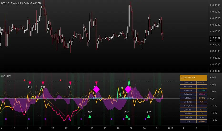 Cosmic Volume Analyzer is an open-source oscillator indicator that applies astrophysics-inspired concepts to volume analysis. It classifies volume into buy/sell categories, calculates volume flow, detects accumulation/distribution phases, identifies climax volume events, and uses gravitational and stellar mass analogies to visualize volume dynamics.