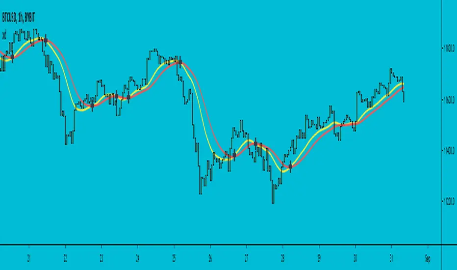 This is a moving average cross script that plots moving averages of moving averages. Easier to find settings with one length instead of two I think.