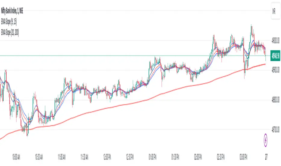 EMA Scalping Strategy for BankniftyEMA 20 and 200 is used in the script. Blue line indicates 20 ema and red line indicates 200 ema. The color of the line turns black when the ema slope angle is above 30.