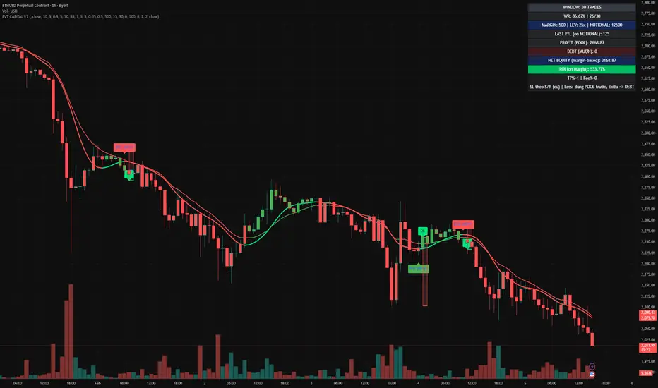It also tracks simulated performance using a fixed margin per trade + futures leverage, and shows results in a table (win rate, last P/L, pool/debt, ROI, etc.) over the last N closed trades, optionally filtered by date range