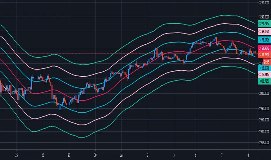 Basically I wanted to make this into one indicator instead of three while adding in some extra options as well... So this is just a Keltner Channel with three channels, all of which have the same length. I have also added in an option to select the moving average for the channel, the original is based on the EMA.