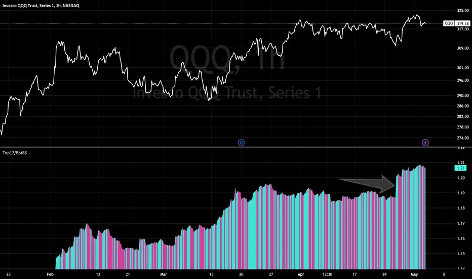 I multiplied the price of each of the top QQQ holdings by their percentage weight, and the bottom 88 holdings for a total of 100. I divide the top 12 weighted price by the bottom 88 weighted price. So I can see when money is flowing in and out of the megacaps. It needs to be updated every quarter, which I may need to do now....