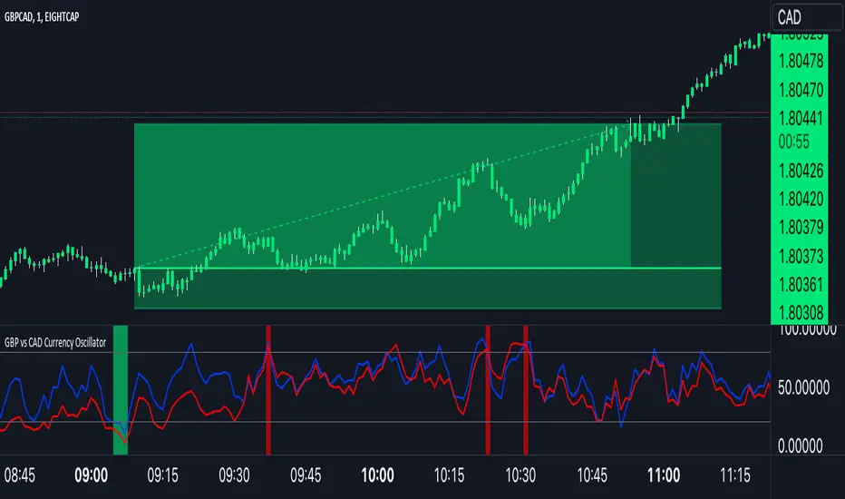 Overbought: When both the GBP and CAD oscillators exceed 80, the background turns red, indicating potential overbought conditions.