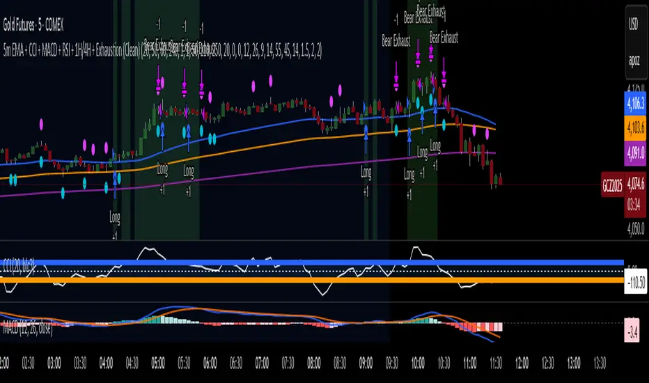 5m EMA + CCI + MACD + RSI + 1H/4H + Exhaustion (Clean)